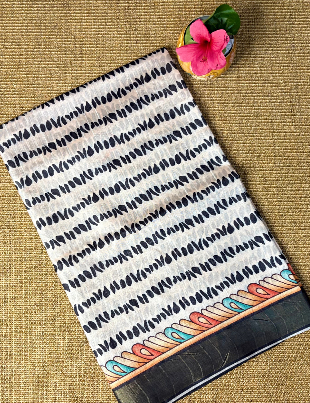 Title: Royal Black& Cream Tussar Silk Saree with Exquisite Floral Border Step into timeless elegance...