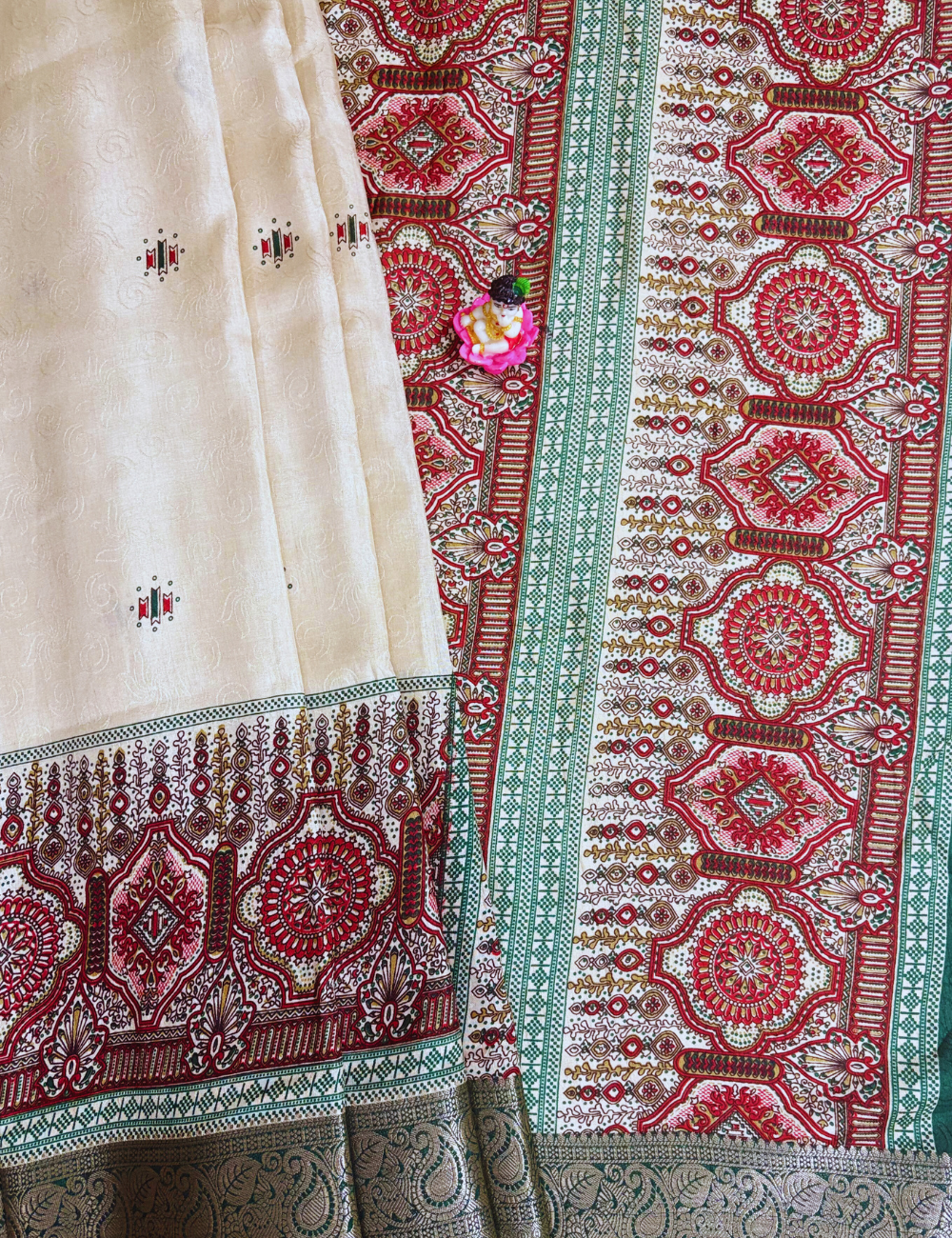 A perfect blend of elegance and tradition, this cream saree is adorned with subtle woven motifs across the body and enhanced with a stunning red and green border. The intricately designed pallu showcases grand traditional patterns that bring out its timeless charm. Lightweight yet regal, this saree is an ideal choice for weddings, festive gatherings, and cultural occasions, making you stand out with grace and sophistication.