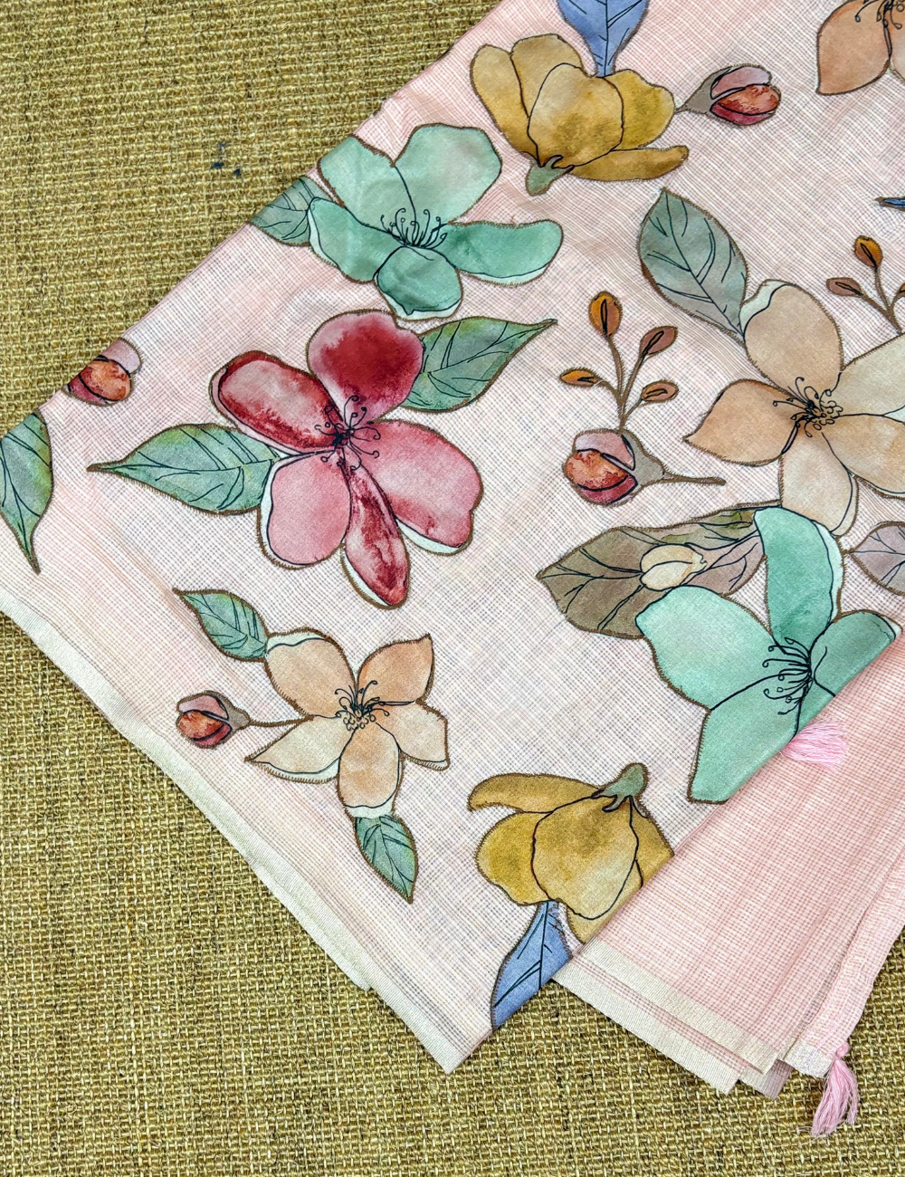 This beautiful Kosha appliqué saree features a soft pastel peach base adorned with intricate multicolour floral appliqué work. Each motif is delicately handcrafted with vibrant shades of green, blue, mustard, pink, and red, giving the saree a graceful and artistic finish. The lightweight fabric drapes comfortably, making it perfect for festive wear, casual gatherings, and special occasions.