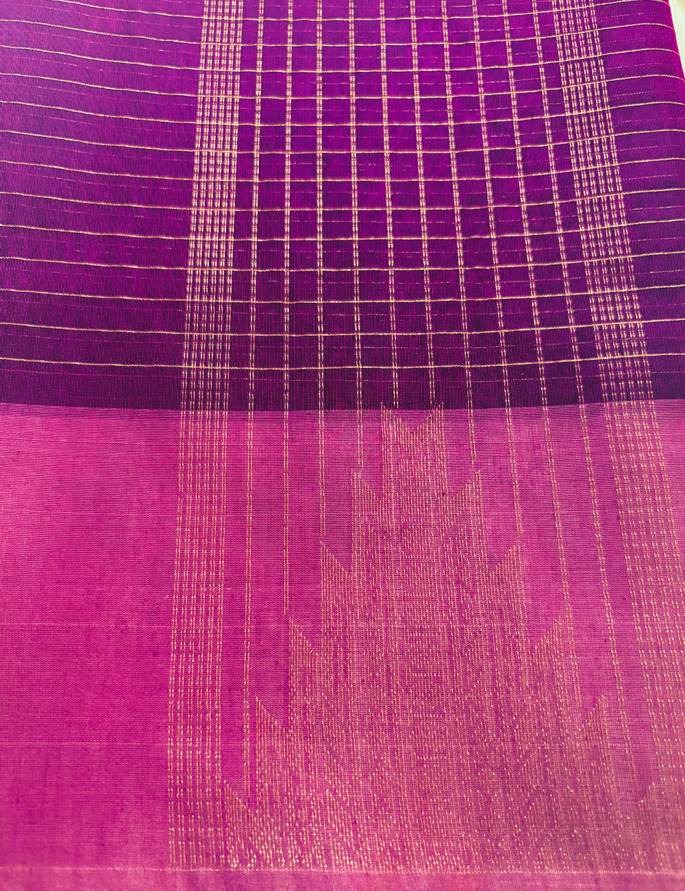 Elevate your elegance with this exquisite silk cotton saree in a rich royal purple body, beautifully complemented by a soft lavender pink border. The delicate grid pattern enhances its traditional charm, while the subtle sheen of silk cotton makes it perfect for both festive and formal occasions. Lightweight yet regal, this saree is a timeless addition to your collection.
