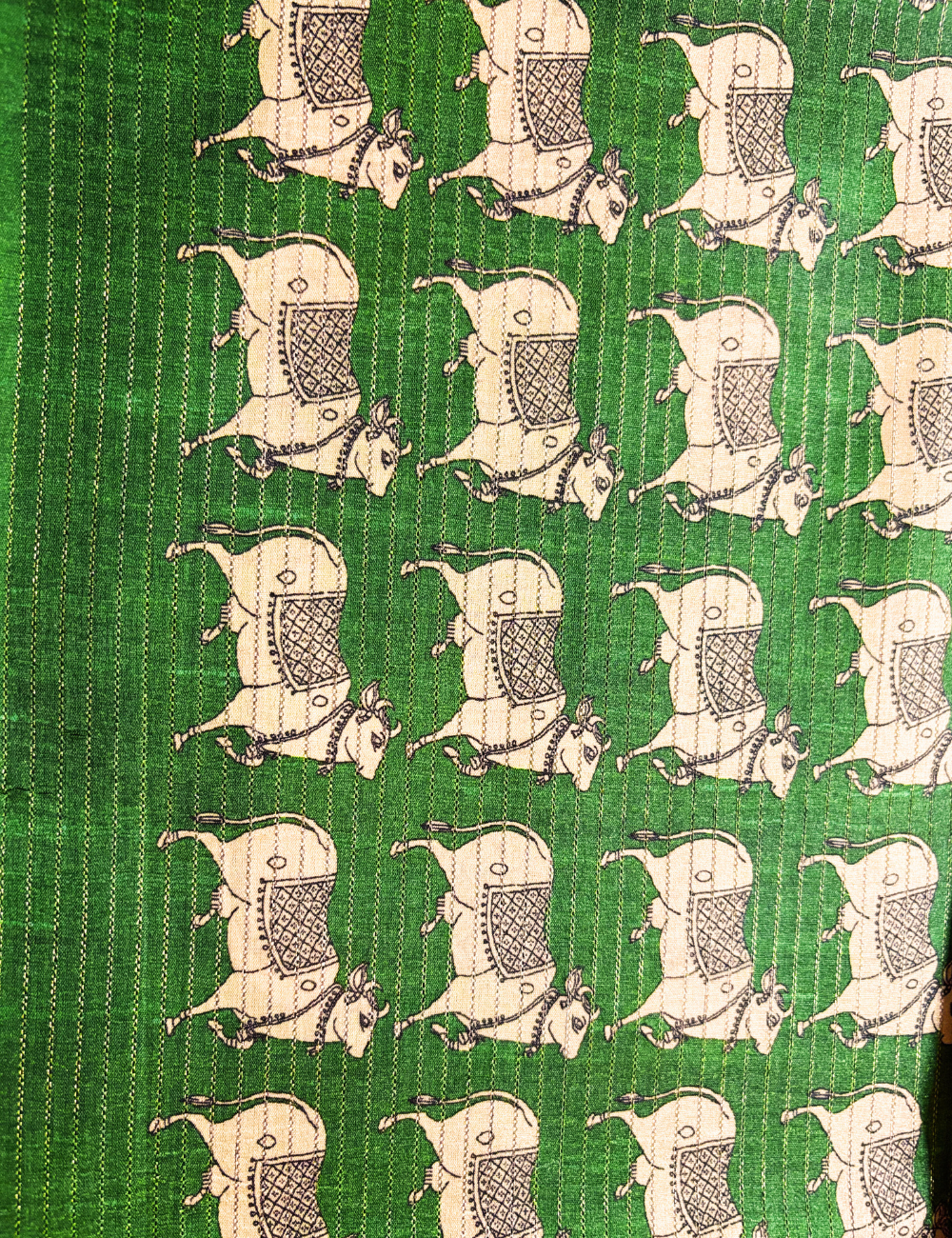 Mustard Yellow & Green Pichwai Print Handloom Saree Celebrate timeless tradition with this exquisite Pichwai print saree, featuring a vibrant mustard yellow body and a rich green pallu adorned with intricate cow motifs inspired by the devotional Pichwai art of Nathdwara. The saree beautifully narrates tales of divinity and culture through its fine artistry, making it more than just attire—it’s a piece of heritage