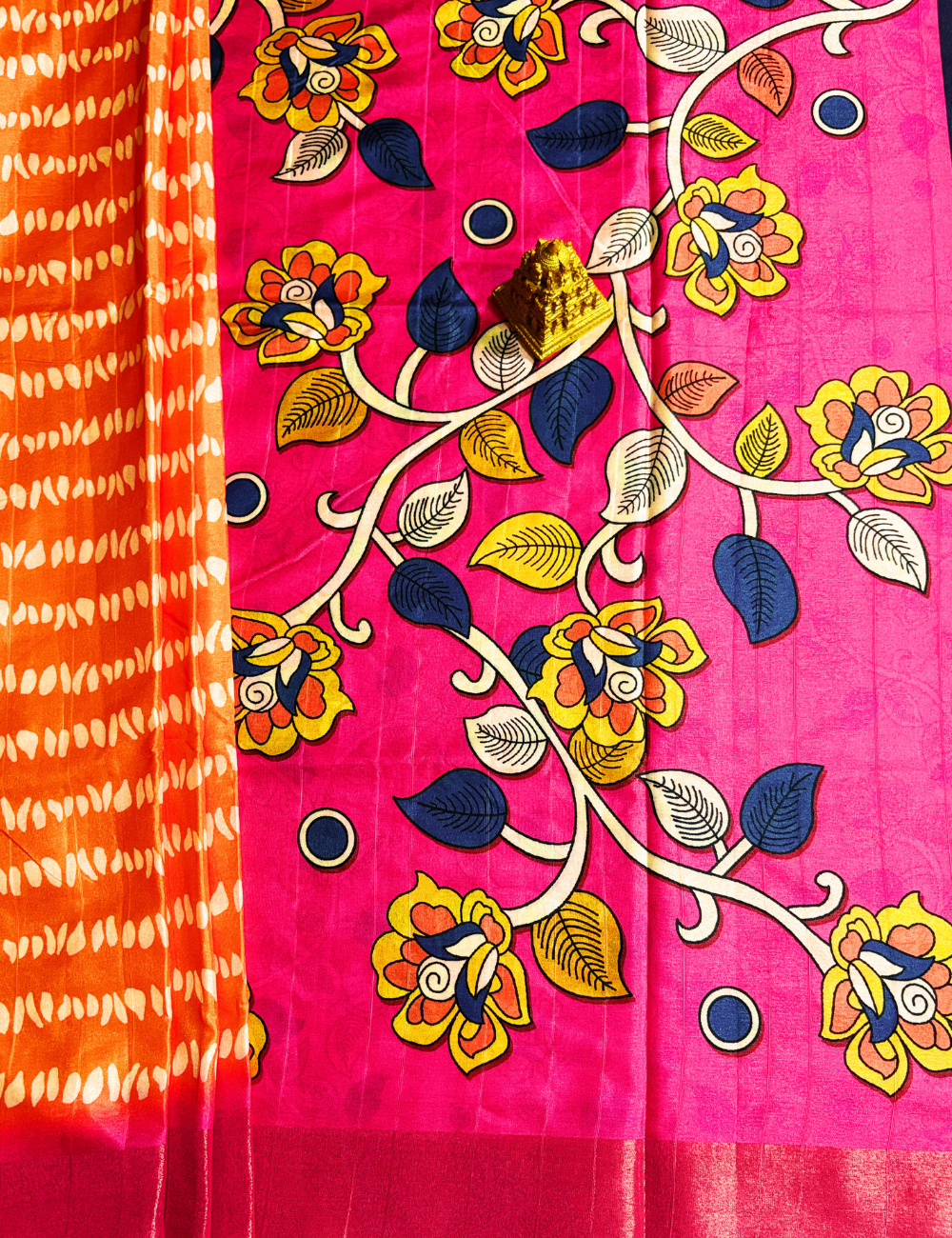 Vibrant Pink Shibori Printed Saree with Kalamkari Pallu Add a pop of color to your wardrobe with this stunning saree featuring a lively pink base adorned with bold floral prints in yellow, blue, and white. The contrasting orange tie-dye style pallu enhances its charm, creating a perfect fusion of tradition and modern design. Lightweight and elegant, this saree is an ideal choice for festive occasions, casual gatherings, or cultural events. Pair it with simple jewelry for a graceful look or accessorize richly for a festive statement.