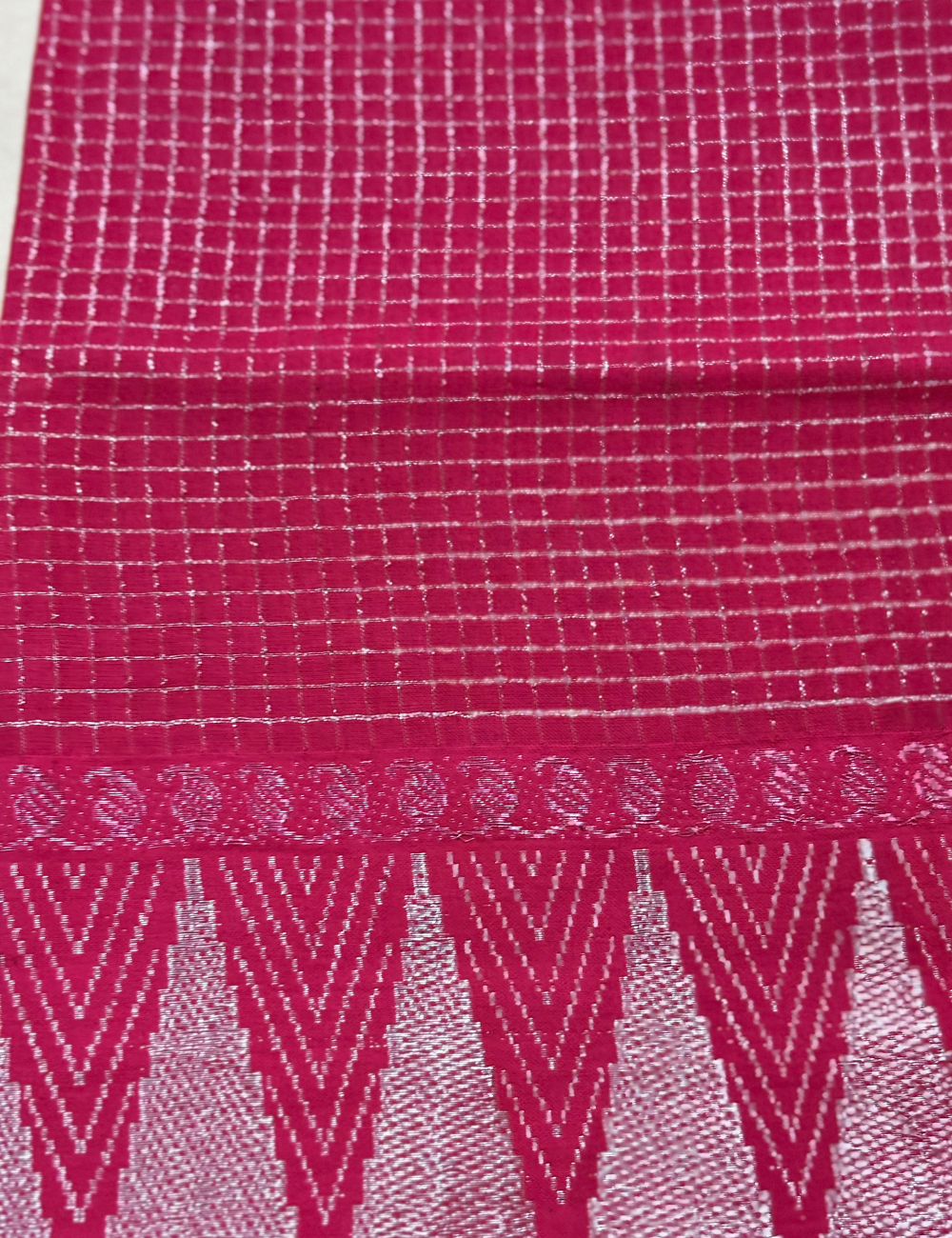 Purple Cotton Saree with Pink Contrast Border A vibrant purple cotton saree beautifully highlighted with a striking pink contrast border featuring traditional geometric motifs. The lightweight cotton fabric ensures all-day comfort, while the rich color combination adds elegance to festive gatherings, cultural events, and casual outings. Comes with a matching blouse piece to complete the graceful look.
