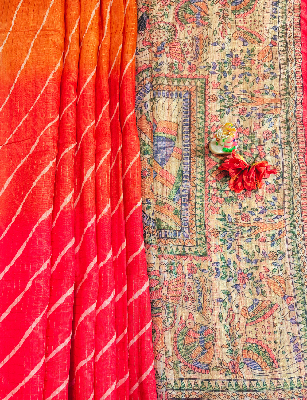This elegant saree beautifully combines two timeless Indian art forms — the vibrant red-orange leheriya pattern across the body and the intricate Madhubani print on the pallu. The leheriya design adds a lively, flowing rhythm, while the pallu showcases detailed folk motifs and floral patterns inspired by traditional Mithila art. Lightweight and breathable, this saree is perfect for festive celebrations, cultural gatherings, and graceful everyday wear.
