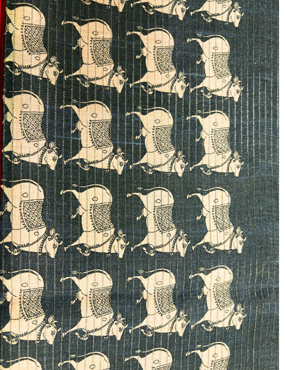 Elegant Red & Teal Pichwai Print Tussar Saree This graceful saree is a stunning representation of traditional Pichwai art, featuring a vibrant red body paired with a teal green pallu adorned with sacred cow motifs in white. The design is inspired by the devotional Pichwai paintings of Nathdwara, symbolizing divinity, prosperity, and timeless culture.