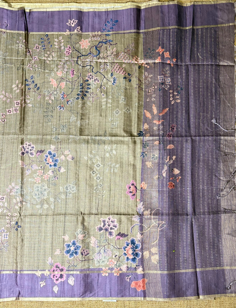 Elevate your ethnic wardrobe with this exquisite handwoven Tussar Silk saree, beautifully crafted in a unique blend of olive gold and deep purple. The body features delicate floral thread embroidery, adding a graceful charm to the natural Tussar texture. The rich contrast purple pallu and border enhance its royal appeal, while the subtle sheen of Tussar silk gives it a timeless, classy look.